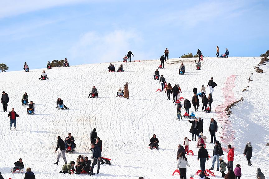 Kış mevsiminde ziyaretçiler, karla kaplı çam ormanlarının arasında bulunan Salda Gölü'ne hakim 2 bin 79 metre rakımlı Tınaztepe'ye kurulu kayak merkezinde, kayağın ve göl manzarasının tadını çıkarıyor.