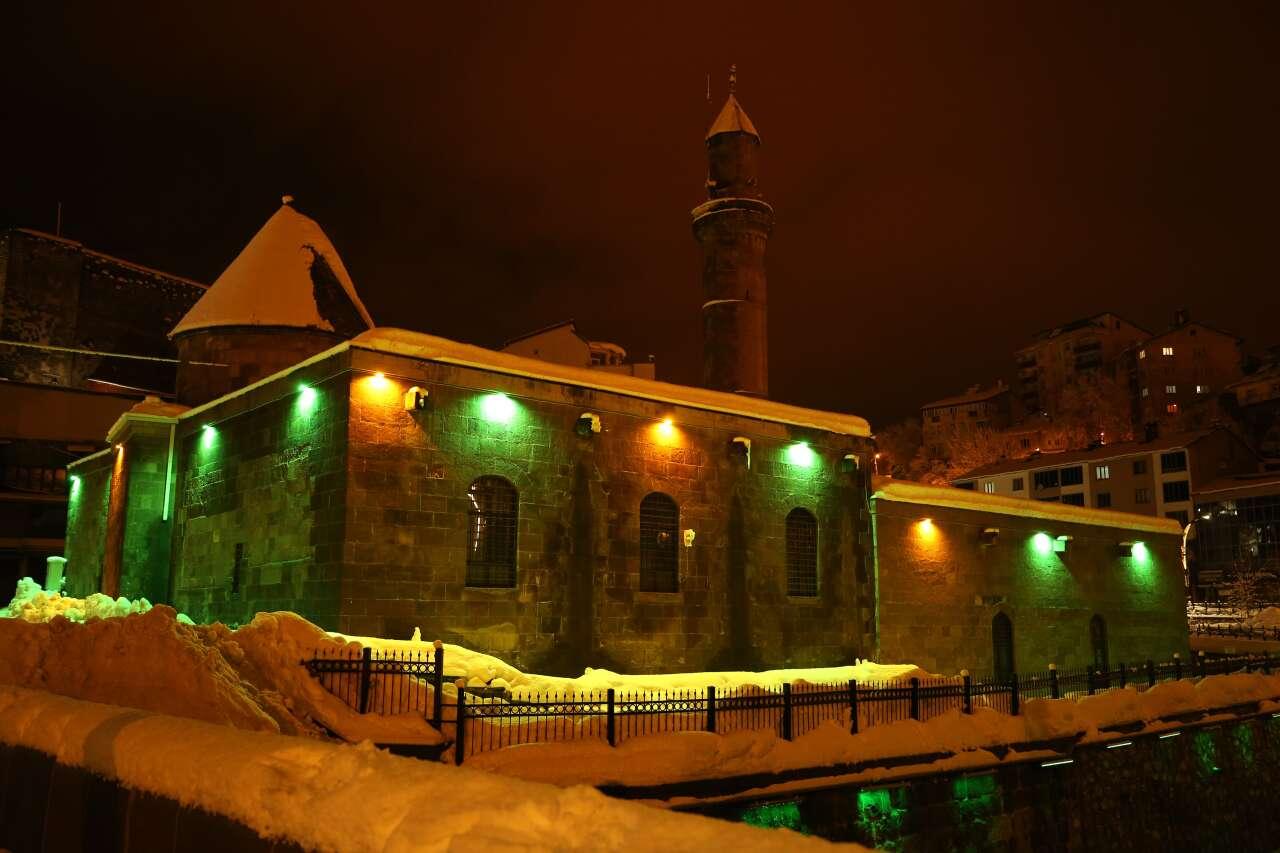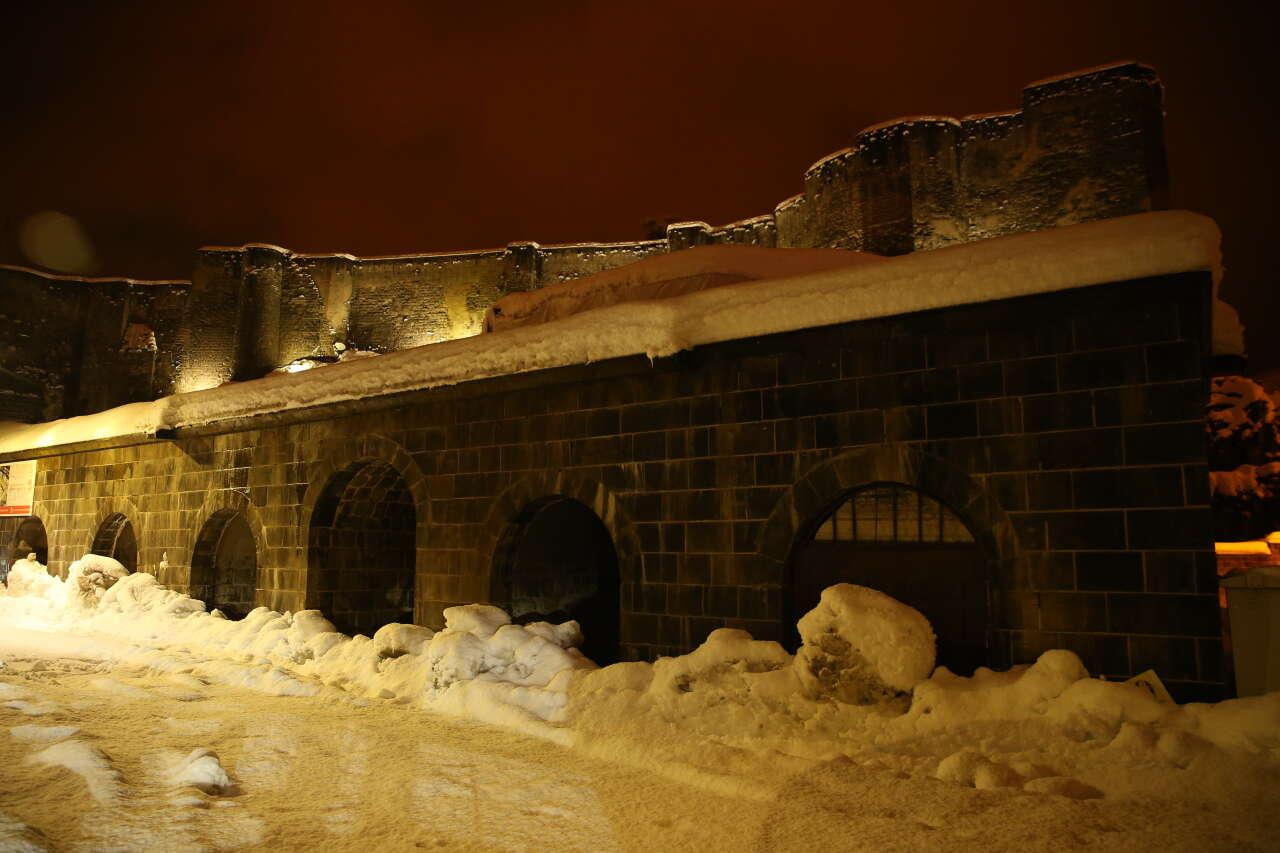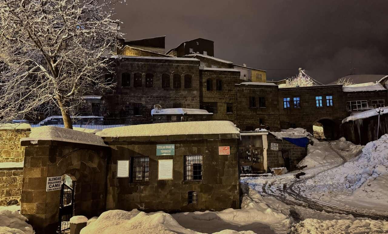 “Sokak Sağlıklaştırma” çalışmalarıyla yenilenen ve ışıklandırılan tarihi mekanlar, kar yağışıyla birlikte estetik görüntüler oluşturdu.