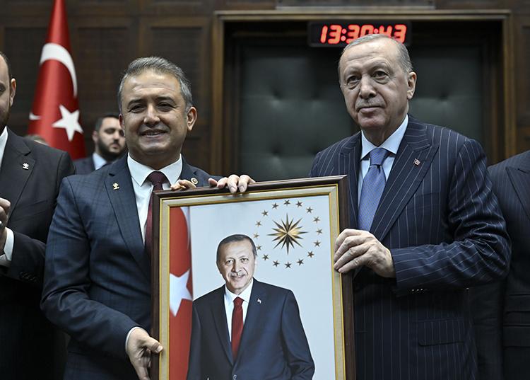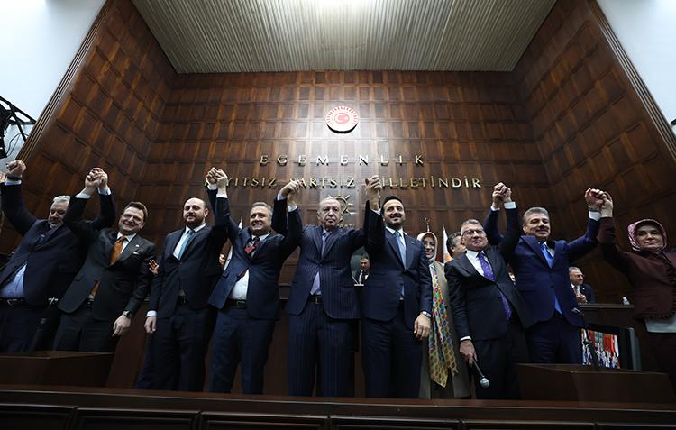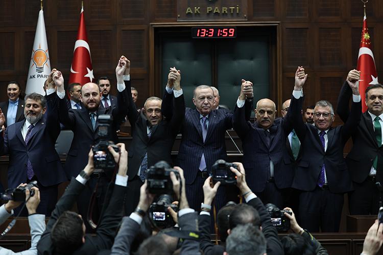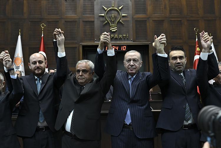 Cumhurbaşkanı Erdoğan'ın konuşmasının ardından AK Parti'ye katılan, Mersin Milletvekili Hasan Ufuk Çakır, Kahramanmaraş Milletvekili İrfan Karatutlu ve İstanbul Milletvekili İsa Mesih Şahin'e rozetlerini taktı.