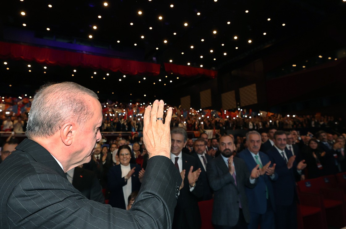 Cumhurbaşkanı Erdoğan, "Salonlara sığmayan şu coşkunuz için sizleri yürekten selamlıyorum. Şu anda bulunduğumuz yer, yerin altında 17 kat, 17 kat yerin altındayız. Belediye başkanlığım dönemimde burayı inşa ettik. Böyle bir salonu hazırladık. Yaparsa 'AK Parti yapar' dedik ve bu salonu inşa ettik."