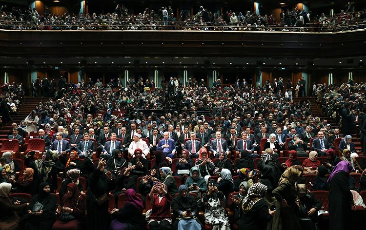 "Burada şunu tüm kalbimle ifade ve ilan etmek istiyorum. Zifiri karanlıkların inşallah kardan aydınlık günlere dönüşeceği dönemler yakındır. İnşallah uzak olmayan bir tarihte coğrafyamızda çiçeklerin açtığı, yüzlerin güldüğü, kalplerin huzurla dolup taştığı o barış iklimini Müslümanlar olarak hep birlikte inşa edeceğiz. Burada bulunan siz değerli kardeşlerime baktıkça bu inancımın daha da pekiştiğini, daha da güçlendiğini ayrıca ve özellikle ifade etmek istiyorum. Rabbim hepimizin yar ve yardımcısı olsun diyorum. Bu düşüncelerle milletimizle birlikte İslam aleminin Ramazan-ı Şerif'ini ve Leyle-i Kadrini bir kez daha tebrik ediyorum."