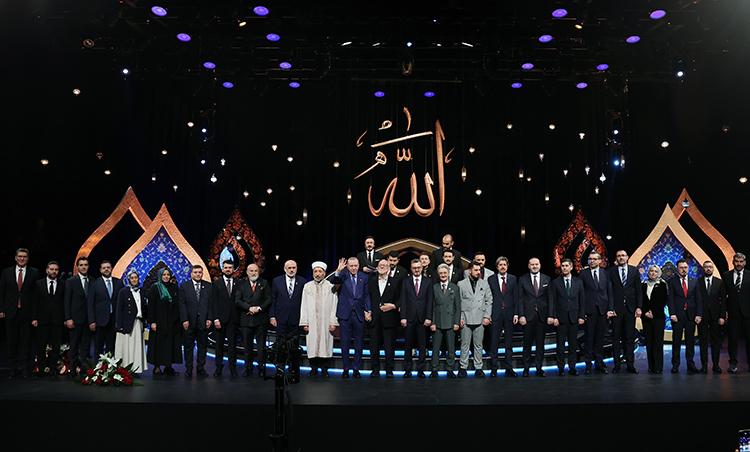İslam'a, Müslümanlara ve insanlığa hizmet etmiş, hayatını 'Emri bil maruf nehyi anil münker' yoluna adamış ve sonunda emaneti sahibine teslim ederek fani dünyadan ukbaya göç etmiş tüm hocaları ve tüm büyükleri rahmetle yad ettiğini dile getiren Erdoğan, "Rabb'im hepsinden razı olsun, onları cennetiyle cemaliyle şereflendirsin. Bizleri de inşallah efendimizin Liva-ül Hamd sancağı altında kendileriyle haşr-u cem eylesin. Birazdan ödüllerini takdim edeceğimiz tilavetleriyle gönül bahçemizi yeşerten Kur'an bülbüllerini tebrik ediyorum." dedi.