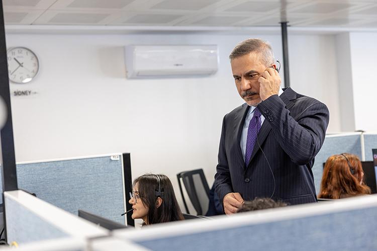 Fidan, "Şu anda Konsolosluk Çağrı Merkezi'nde bulunmaktayız. Burada 7/24 arkadaşlarımız faaliyet göstermekte. Dünyanın dört bir tarafında bulunan vatandaşlarımızın taleplerine, sorularına cevap verilmekte. Özellikle hem alandaki misyonlardaki arkadaşlarımız hem de merkezdeki arkadaşlarımız bir yazılım marifetiyle bu çağrıları yönetmekte ve cevap vermekte." ifadelerini kullandı.