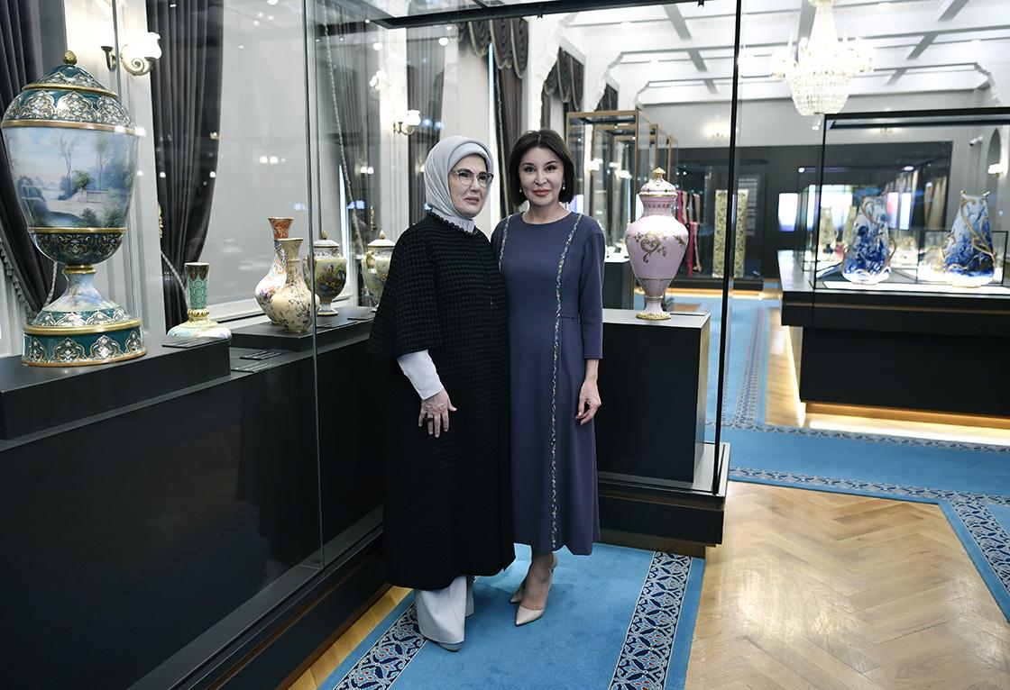 Emine Erdoğan, Ankara Palas'ın girişinde karşıladığı Mirziyoyeva ile Hereke dokumaları, yıldız porselenleri ve diplomatik hediyelerin de aralarında olduğu Osmanlı ve Cumhuriyet dönemine ait seçkin eserlerden oluşan müzeyi gezdi.