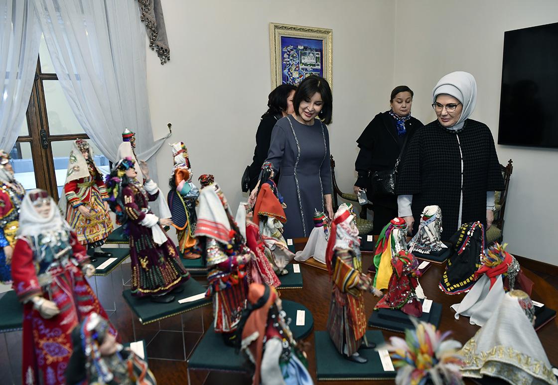 Lider eşleri Ankara Palas'ta, olgunlaşma enstitülerinde üretilen kitre bebek, çini ve seramik ürünler ile Türk işi, sırma, hesap işi ve beyaz iş gibi nakış teknikleriyle hazırlanan ürünlerin sergilendiği bölümü de ziyaret ederek, çalışmalar hakkında bilgi aldı.