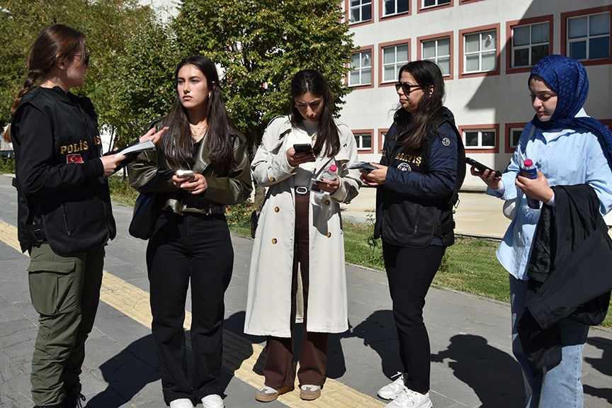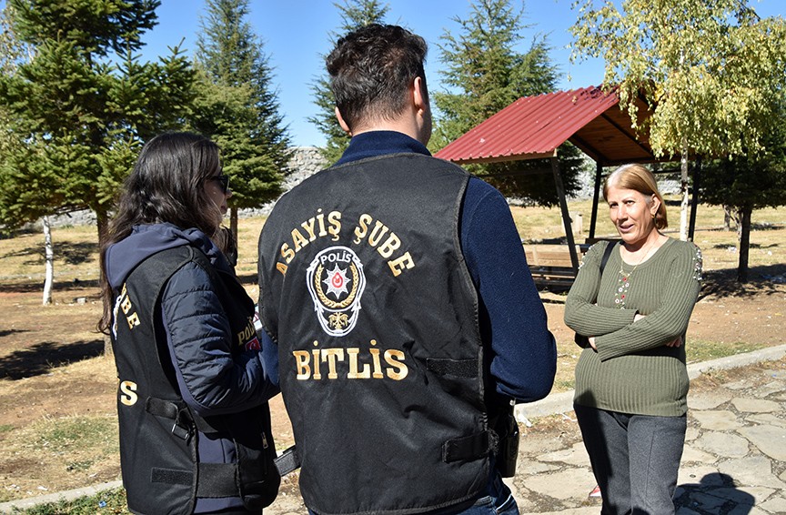 Bitlis'te cadde ve sokakları gezerek, kadınları Kadın Destek Uygulaması'na (KADES) ilişkin bilgilendiren Emniyet Müdürlüğü ekipleri, yapılan ihbarların yanlış yerlere düşmemesi için telefonlardaki konum özelliğinin açık tutulması uyarısında bulundu.