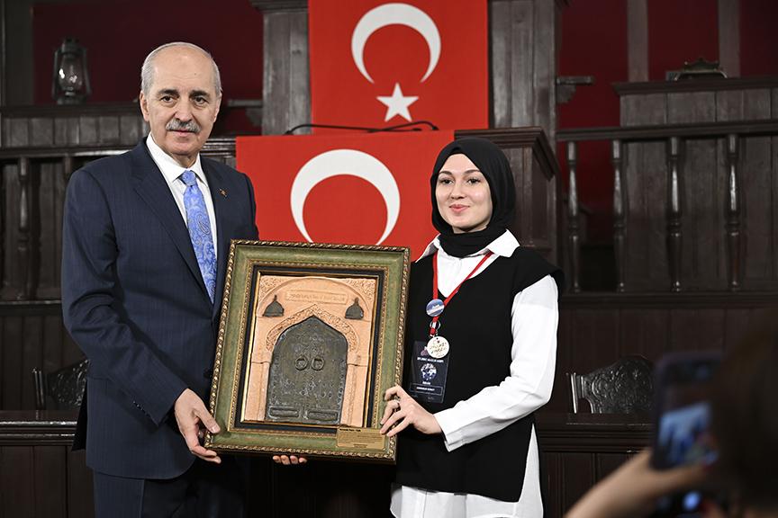 Üniversite öğrencisi Semanur Güney, TBMM Başkanı Kurtulmuş'a tablo hediye etti.