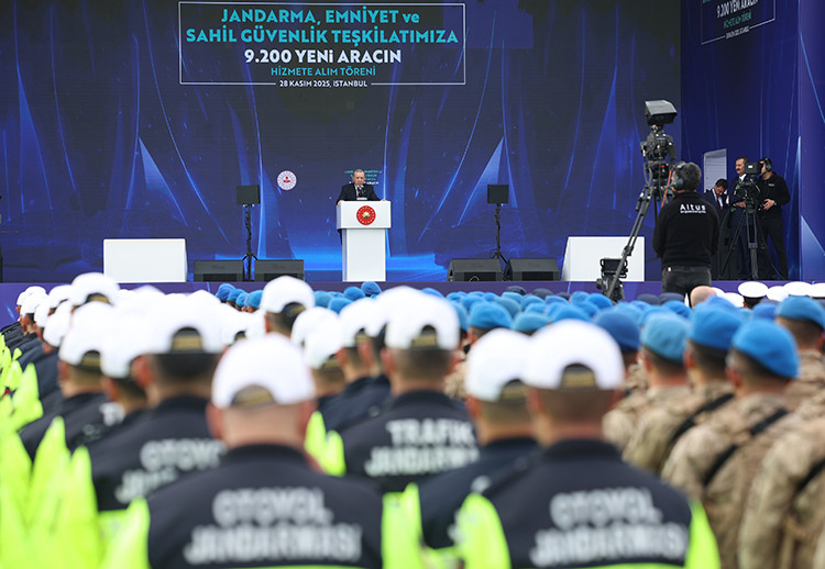 Cumhurbaşkanı Erdoğan, Atatürk Havalimanı'nda düzenlenen Jandarma, Emniyet ve Sahil Güvenlik Teşkilatı için 9 bin 200 yeni aracın hizmete alım törenindeki konuşmasında, alandaki katılımcıları selamlayarak İstanbul'la birlikte 81 ildeki güvenlik güçlerini selamladı.